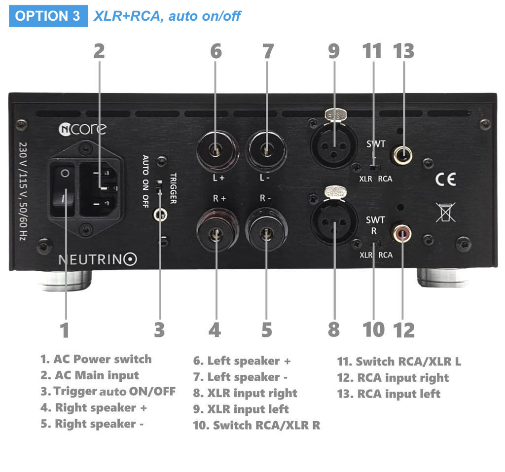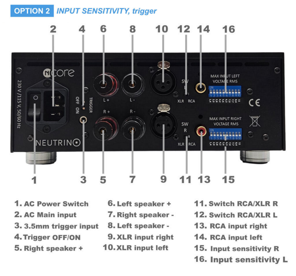 Options | (Option 1) XLR+RCA, trigger or (Option 2) INPUT SENSITIVITY, trigger or (Option 3) XLR+RCA, auto on/off or (Option 4) INPUT SENSITIVITY, auto on/off |