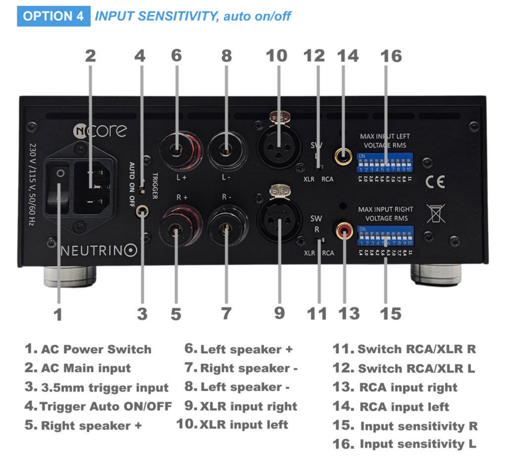 INPUT SENSITIVITY........this means that there are two input connectors on rear panel of amplifer: XLR and RCA. There is a 2-way micro switch between them to choose whether you want to use XLR(balanced) or RCA(unbalanced) input. In addition, there is a 10-way micro switch with 10 positions for max input voltage selection. With different positions of 10-way switch we change gain of Hypex amplifier input buffer. In this way, the input sensitivity circuit will have absolutely no influence on sound. Different brands of preamplifiers have different maximum output voltage. Preamplifiers with different maximum output voltages: 1,4 2,0 2,8 4,2 5,6 6,3 7,0 7,7 8,4 11, could be used.